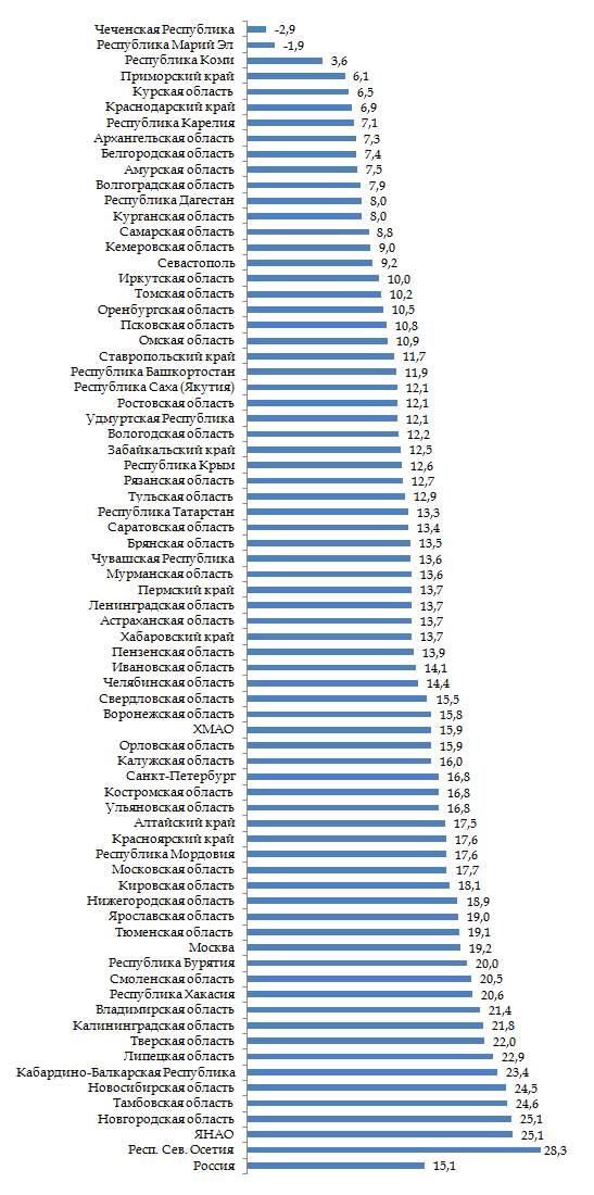 Фото Виктора БобыряВ тройке лидеров - Республика Северная Осетия с 28,3, Ямало-Ненецкий автономный округ и Новгородская область с 25,1. В Чечне индекс ушел в минус на 2,9, в Марий Эл - на 1,9. Небольшой, но все же прирост в Коми - 3,6.