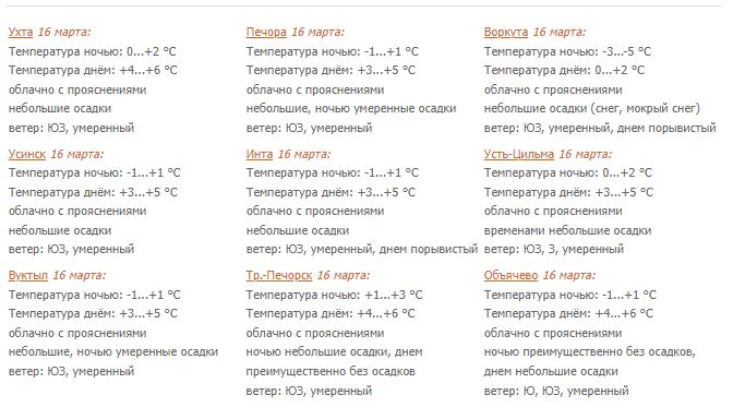 Ветер южный, юго-западный 8-13 м/с, утром и днем на крайнем северо-востоке порывами 15-20 м/с. Температура ночью +2...-3, днем +2...+7, на крайнем северо-востоке ночью -1...-6, днем -1...+4 °С.В Сыктывкаре облачно с прояснениями. Ночью преимущественно без осадков, днем небольшие осадки. Ветер южный, юго-западный 7-12 м/с. Температура ночью 0...+2, днем +4...+6°С.