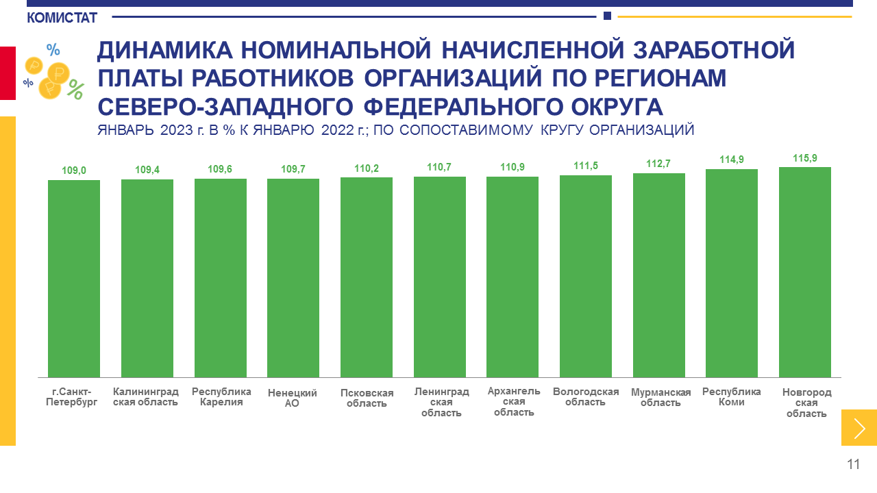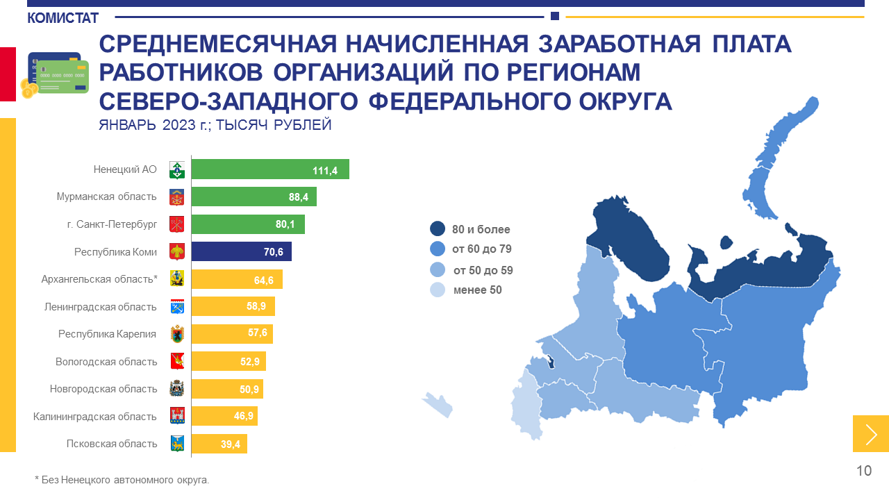 Наибольшая среднемесячная зарплата среди регионов СЗФО зафиксирована в Ненецком автономном округе - 111 400 рублей.