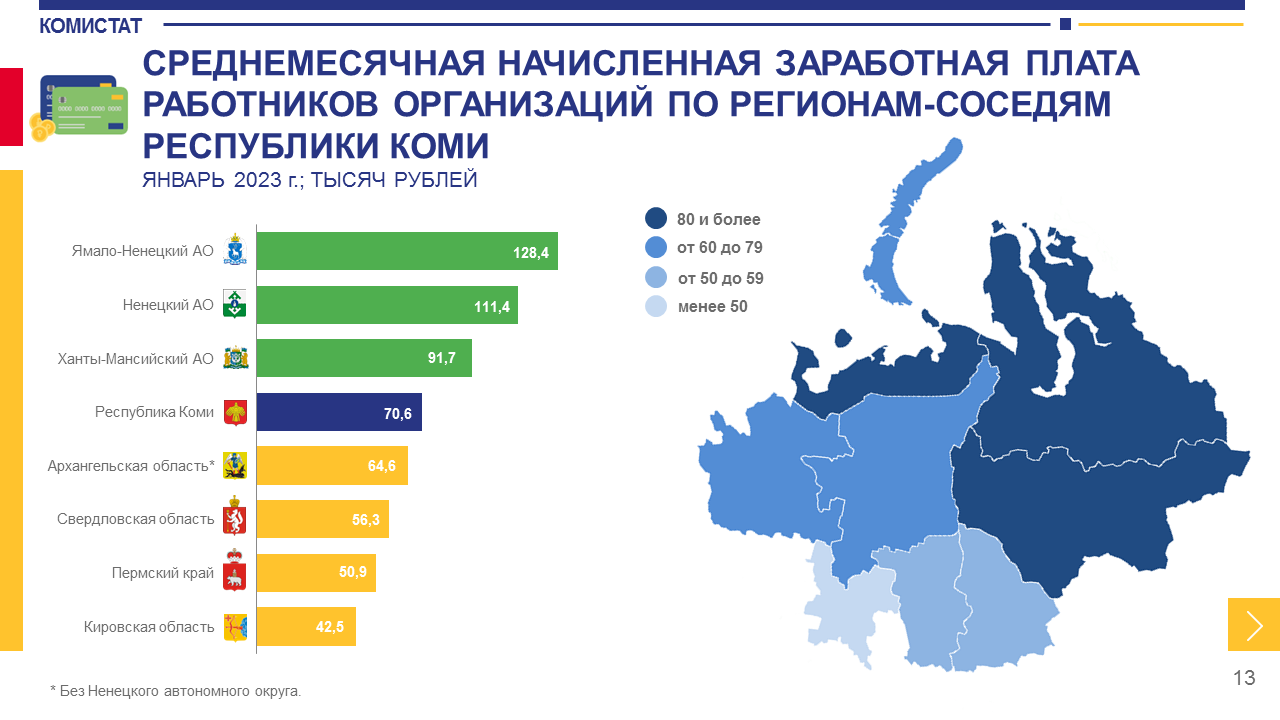 Согласно данным Комистата, в республике средняя зарплата в январе составила 70 552 рубля. В рейтинге ниже Коми располагаются Архангельская, Ленинградская области и Республика Карелия.