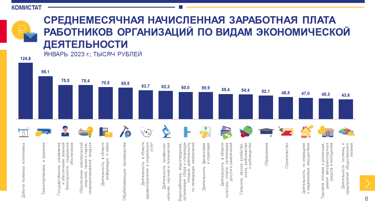 Наибольшая заработная плата традиционно у работников отрасли добычи полезных ископаемых - почти 125 тыс. рублей. На втором месте расположилась деятельность по транспортировке и хранению - 95 тыс. рублей. Доходы сотрудников госуправления и обеспечения военной безопасности; социального обеспечения - на третьем месте, в январе каждый в среднем получил 75,5 тыс. рублей.