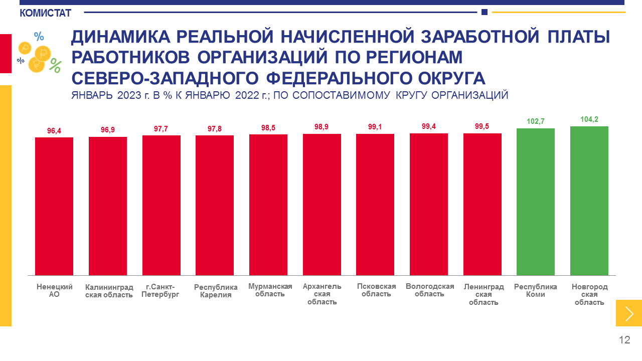 По динамике номинальной начисленной и реальной заработной плате работникам организаций по регионам СЗФО Коми занимает вторые места.